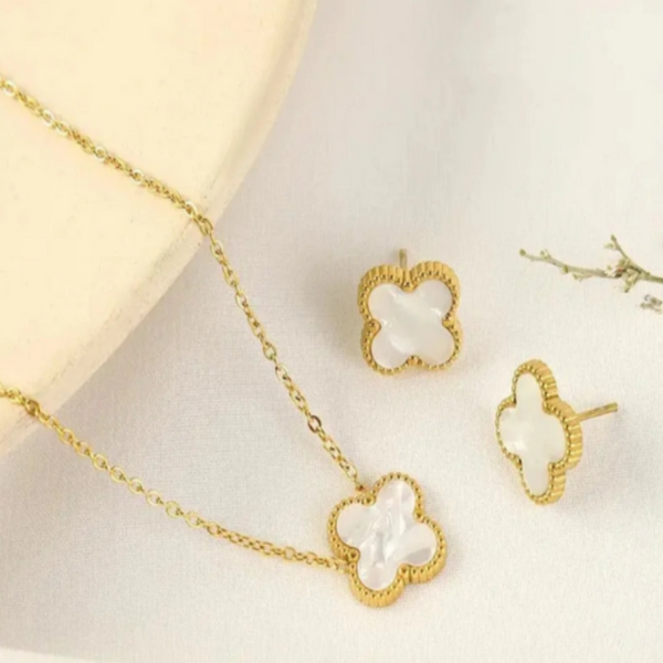 A graceful jewellery set featuring the classic white clover design, symbolizing luck, purity, and timeless beauty. Perfect for women who love chic and versatile jewellery.